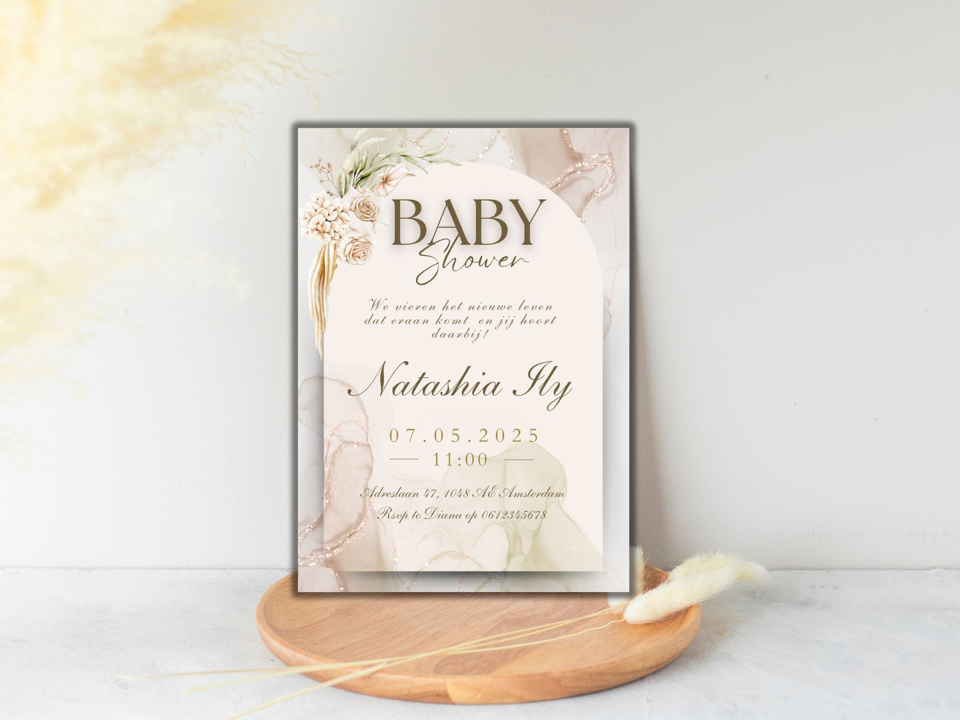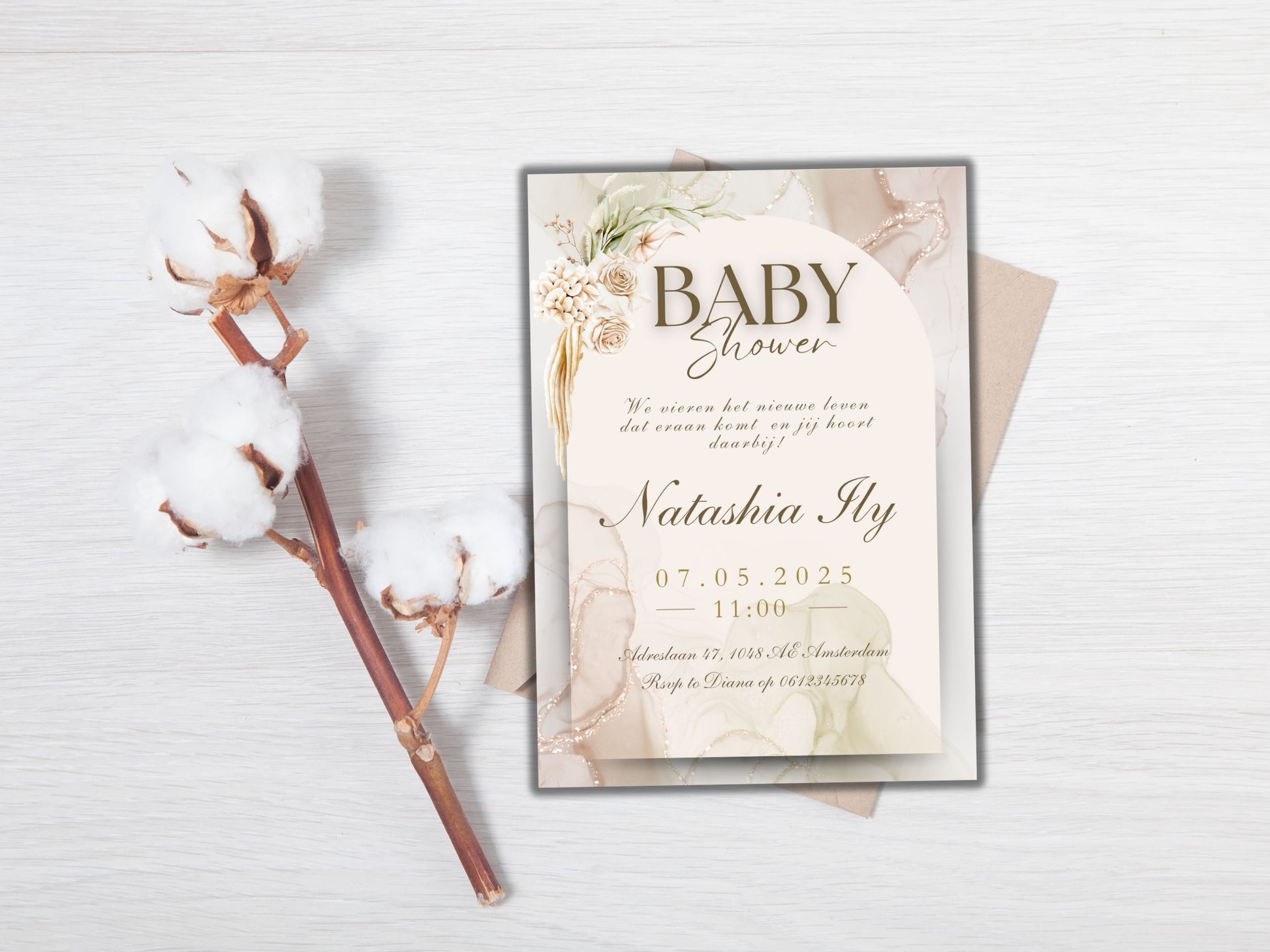 Met een strak design, neutrale tinten en stijlvolle typografie is deze kaart ideaal voor een elegante babyshower of gender reveal. Een uitnodiging die net zo smaakvol is als het moment dat je viert.