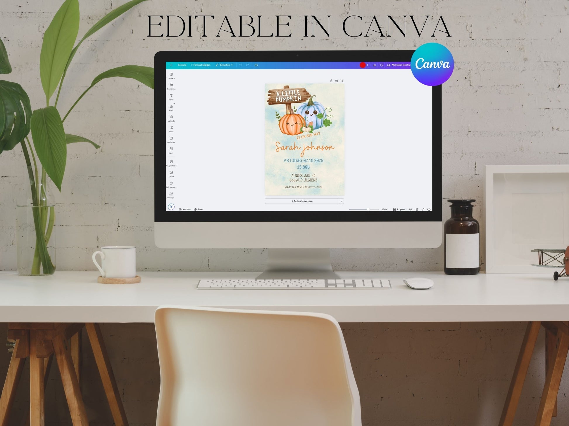Klik op de link en de uitnodiging opent automatisch in Canva (gratis te gebruiken via je browser of de app). Je hebt geen ervaring nodig Canva werkt super eenvoudig. -
