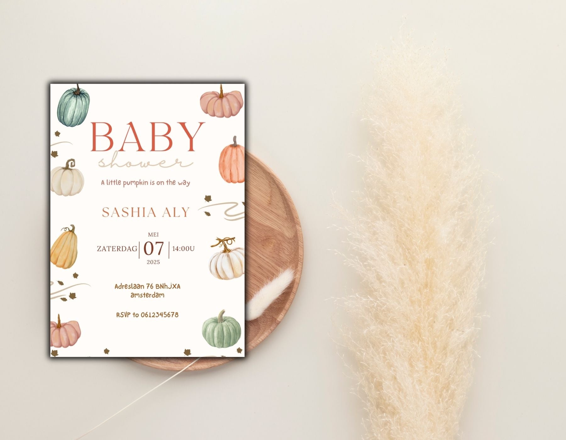 Stijlvol, tijdloos en vol charme dat is deze prachtige “A Little Pumpkin on the Way” uitnodiging. Met subtiele herfstaccenten, warme kleuren en een elegante uitstraling past dit ontwerp perfect bij een chique babyshower of gender reveal. Een uitnodiging die niet alleen informeert, maar ook meteen de bijzondere sfeer van jullie feest laat voelen. Een elegante start van een dag om nooit te vergeten