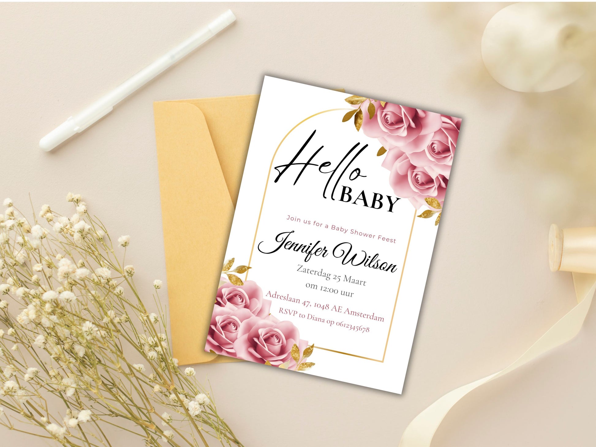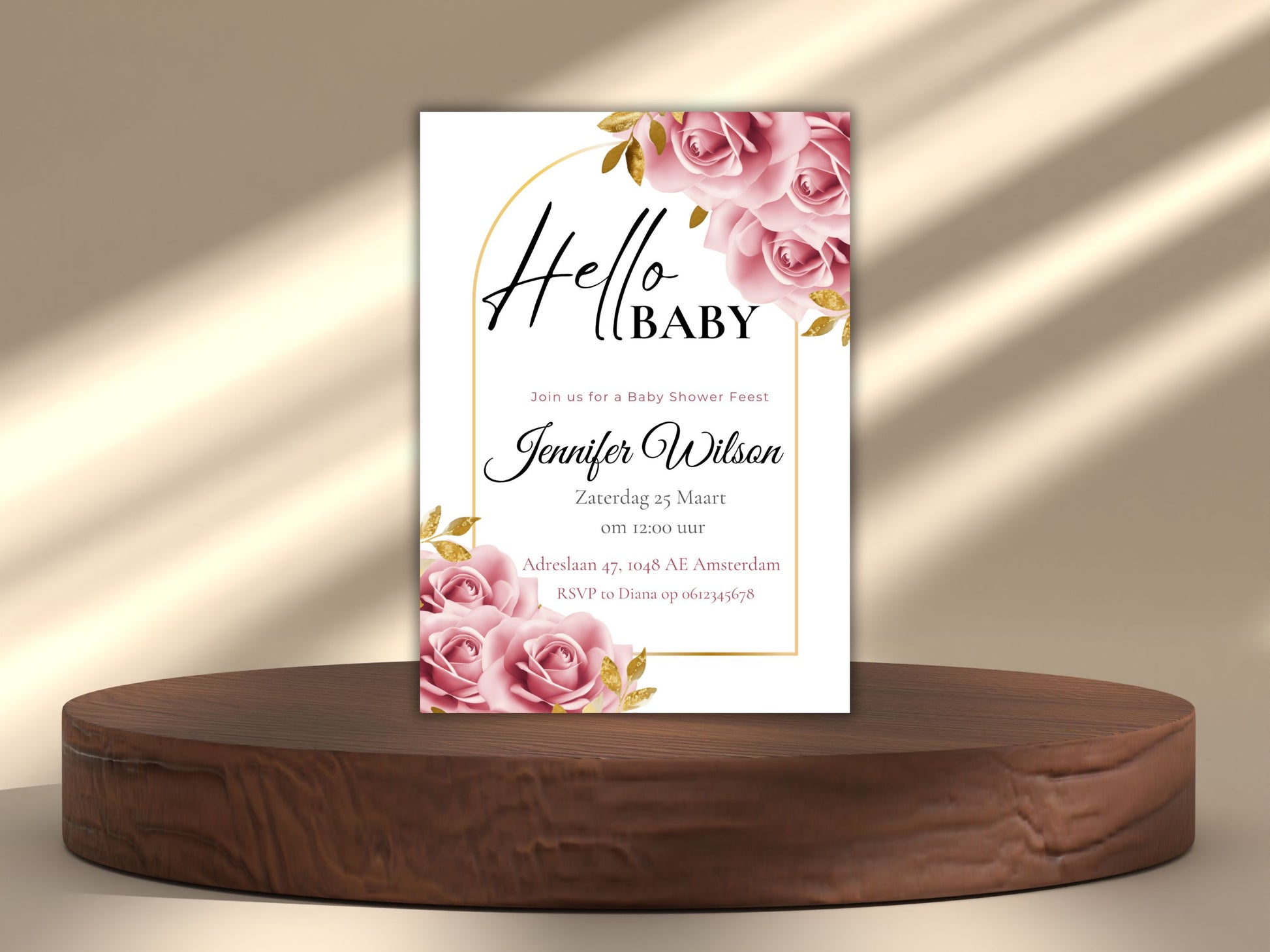 Breng romantiek en zachtheid in je babyshower met deze prachtige digitale babyshower uitnodiging in rozenthema. De uitnodiging is versierd met rozen in zachte tinten en goud accenten, wat zorgt voor een elegante en dromerige uitstraling. Perfect voor een babyshower voor een meisje of een feest met een klassiek, vrouwelijk tintje.