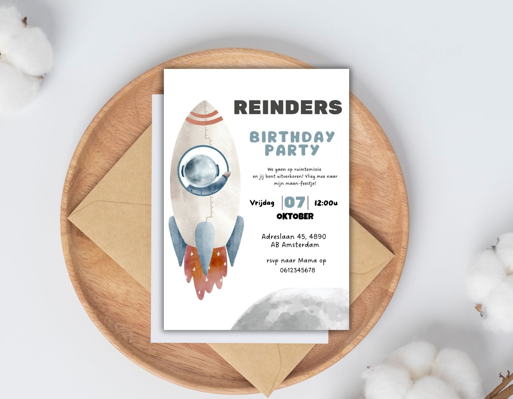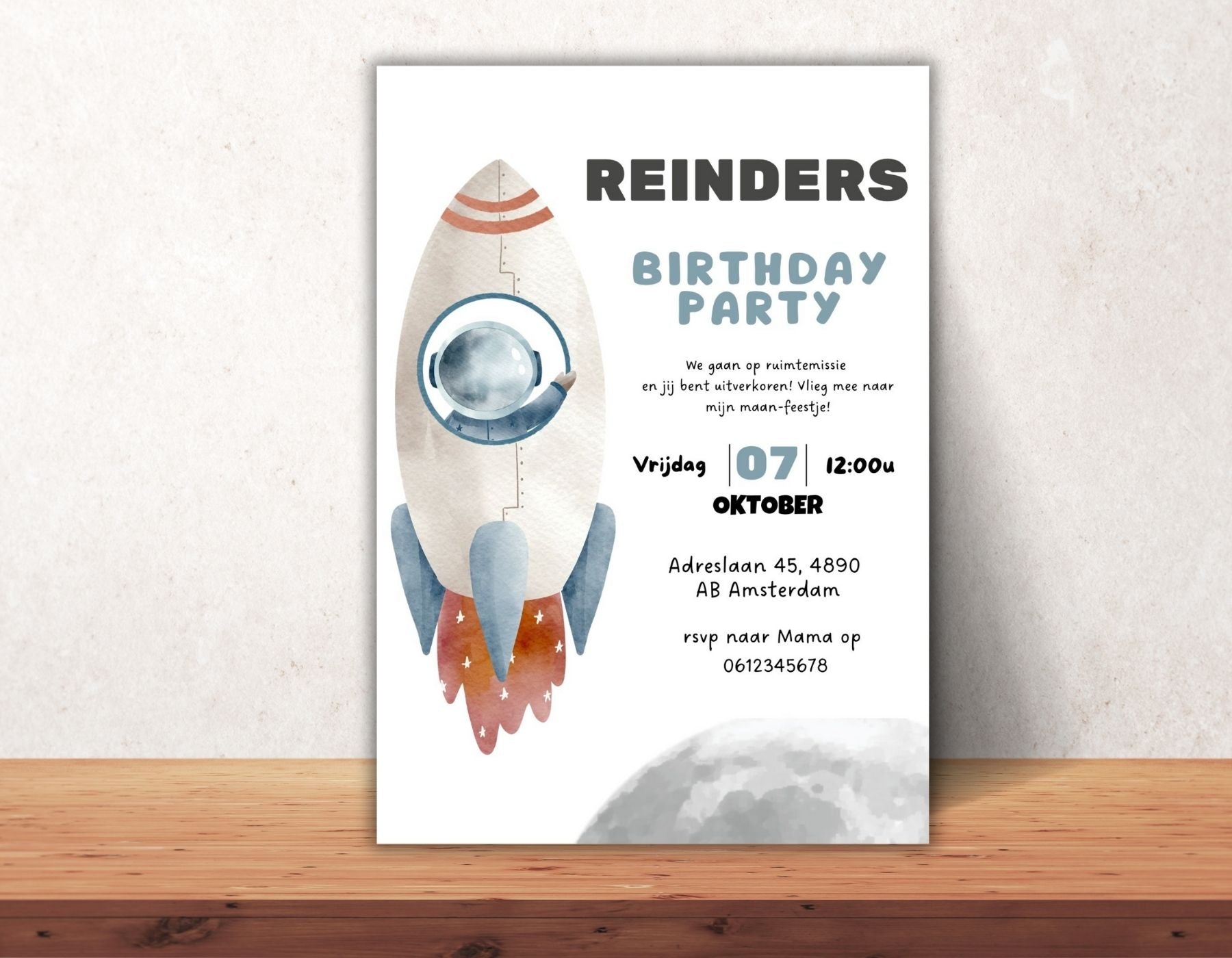Nodig vrienden en familie uit voor een buitenaards verjaardagsfeest met deze digitale verjaardagsuitnodiging in maanmissie-thema! Het speelse ontwerp met een raket en maan maakt van elke uitnodiging een mini-avontuur. Perfect voor kinderen die dol zijn op ruimtevaart, planeten en fantasie.