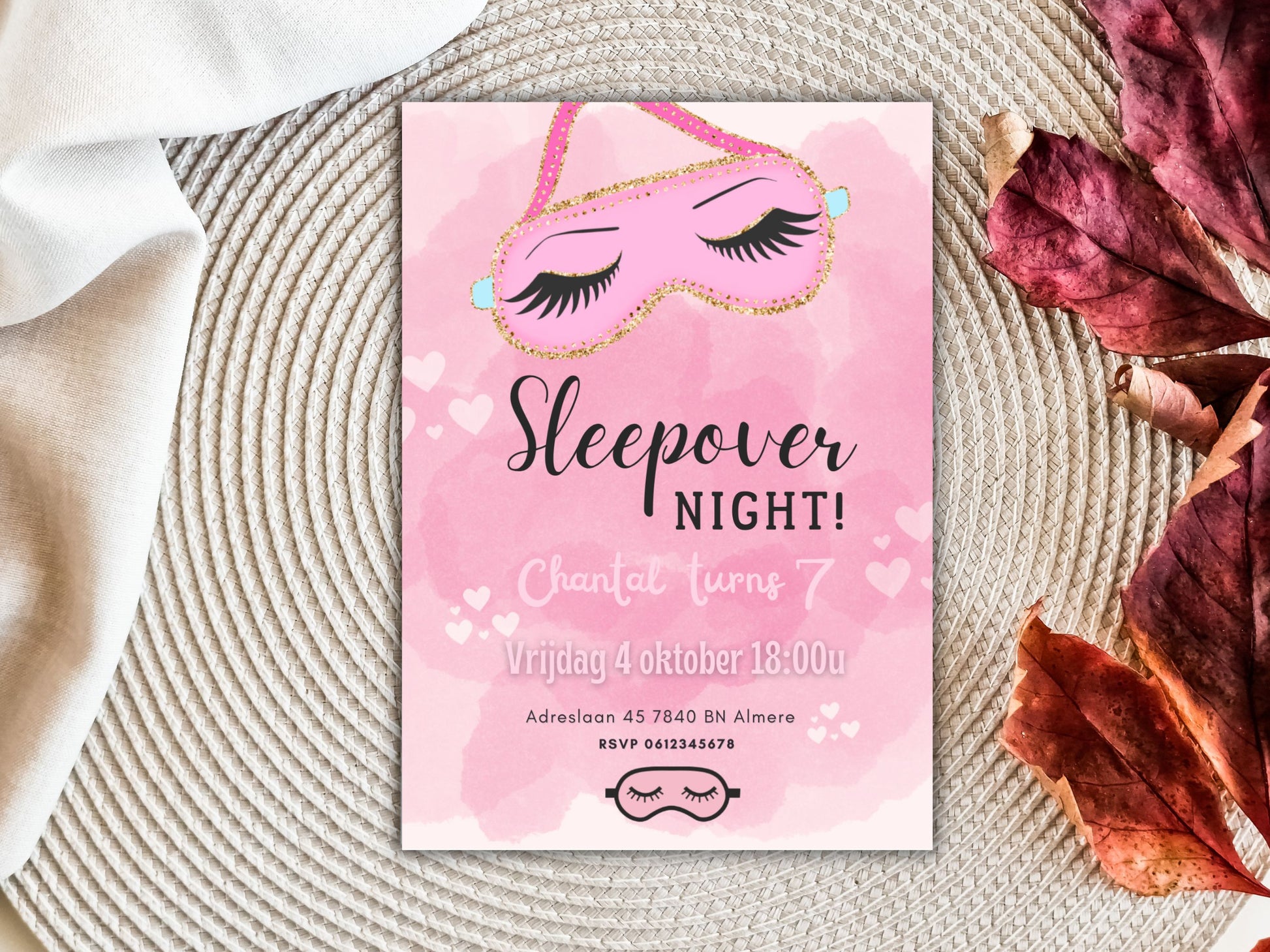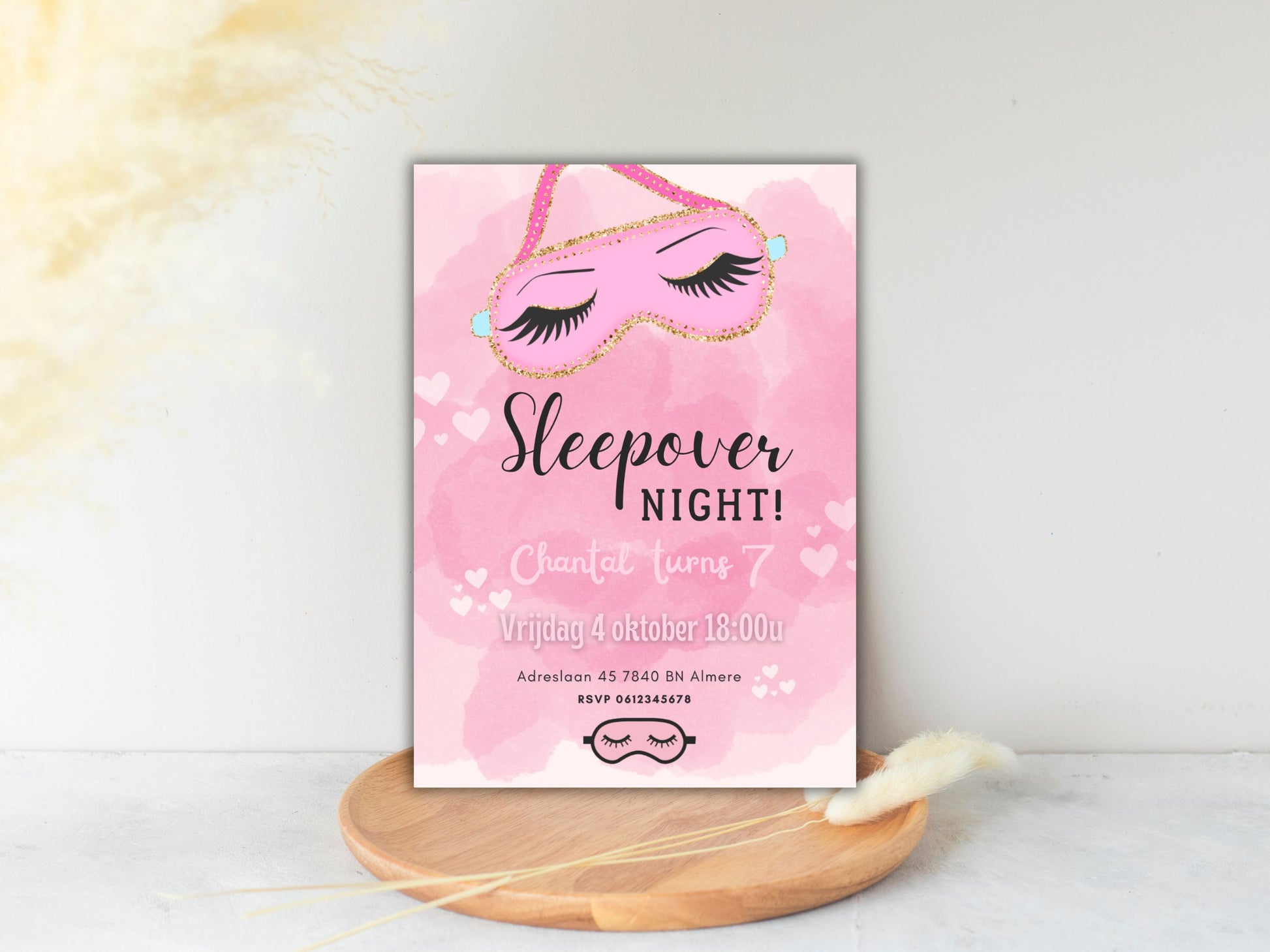 Laat het feest beginnen met een onvergetelijke sleepover! Onze digitale sleepover uitnodiging voor meisjes zorgt ervoor dat iedereen al zin krijgt in een avond vol plezier, kussengevechten, spelletjes en knusse momenten. Het vrolijke en kleurrijke ontwerp met slaapmasker zet meteen de toon voor een gezellig en onvergetelijk feestje.