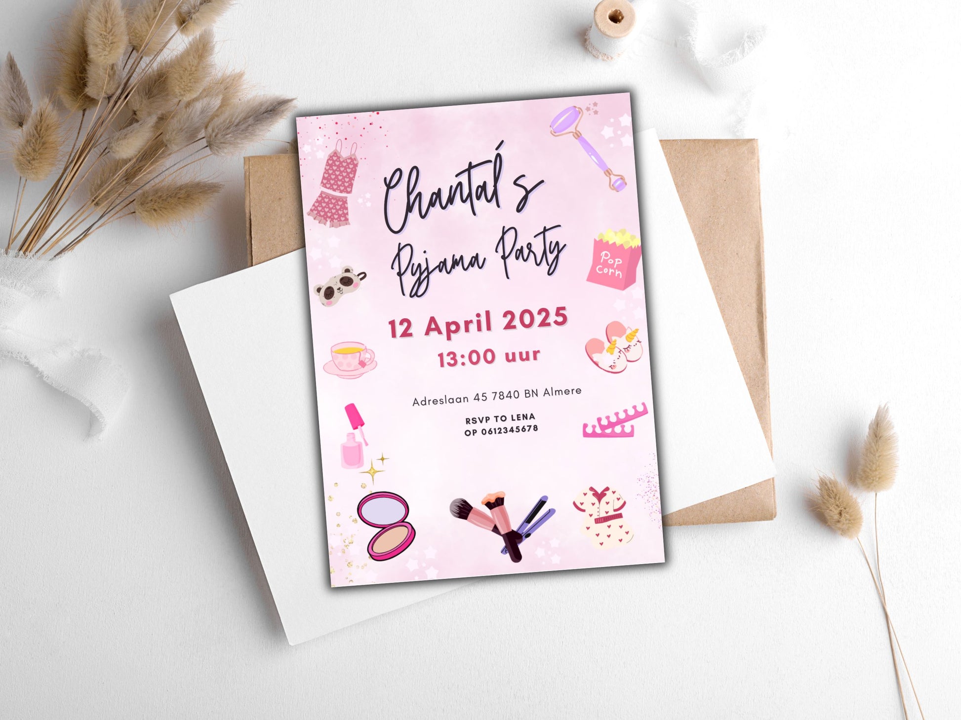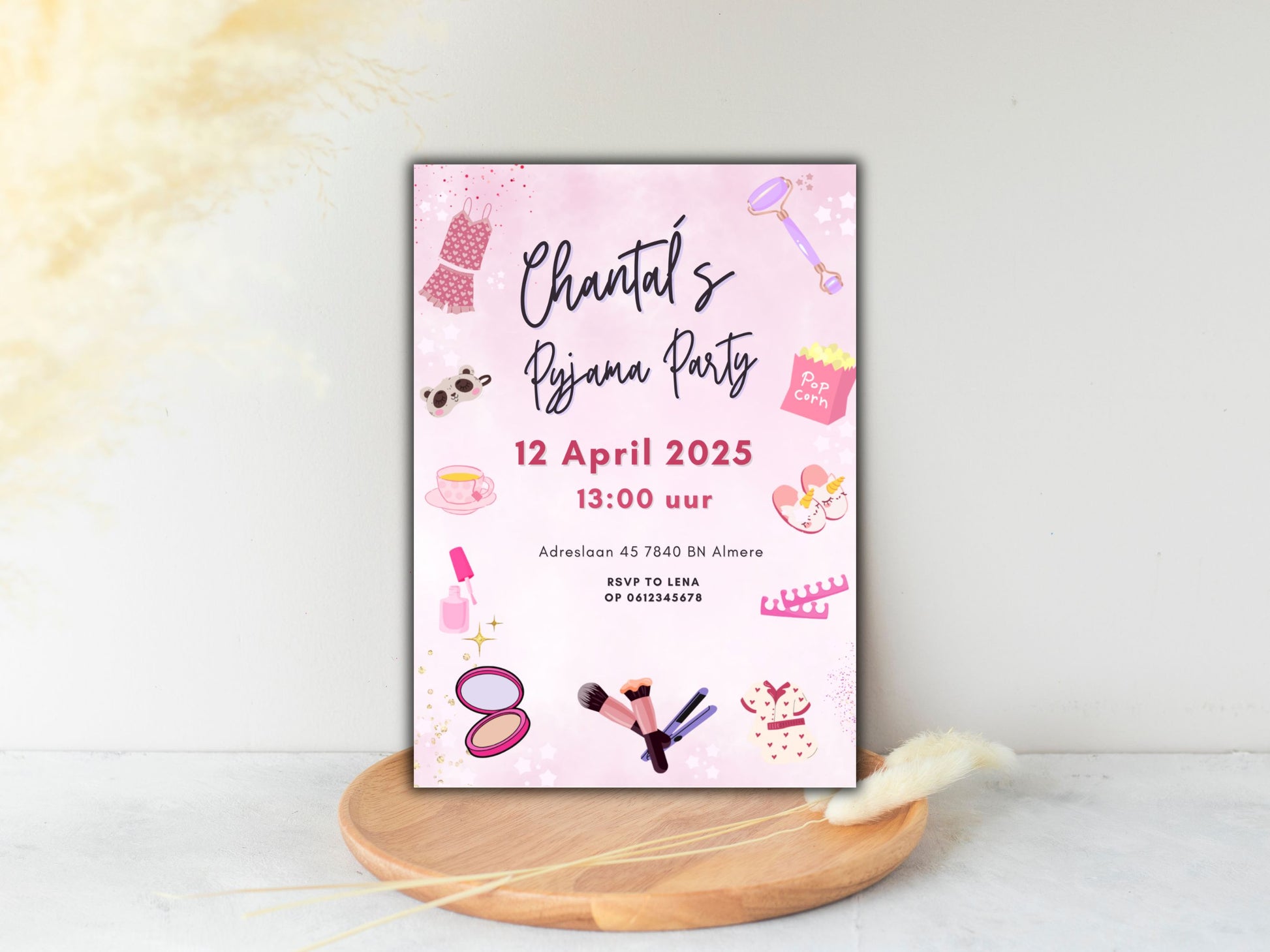 Wat is er gezelliger dan een pyjamafeestje vol kussengevechten, popcorn en lachen tot laat in de avond? Met onze digitale pyjama verjaardagsuitnodiging wordt het feest al bij de uitnodiging extra leuk. Het speelse en schattige ontwerp met pyama party elementen zorgt meteen voor de juiste sfeer.
