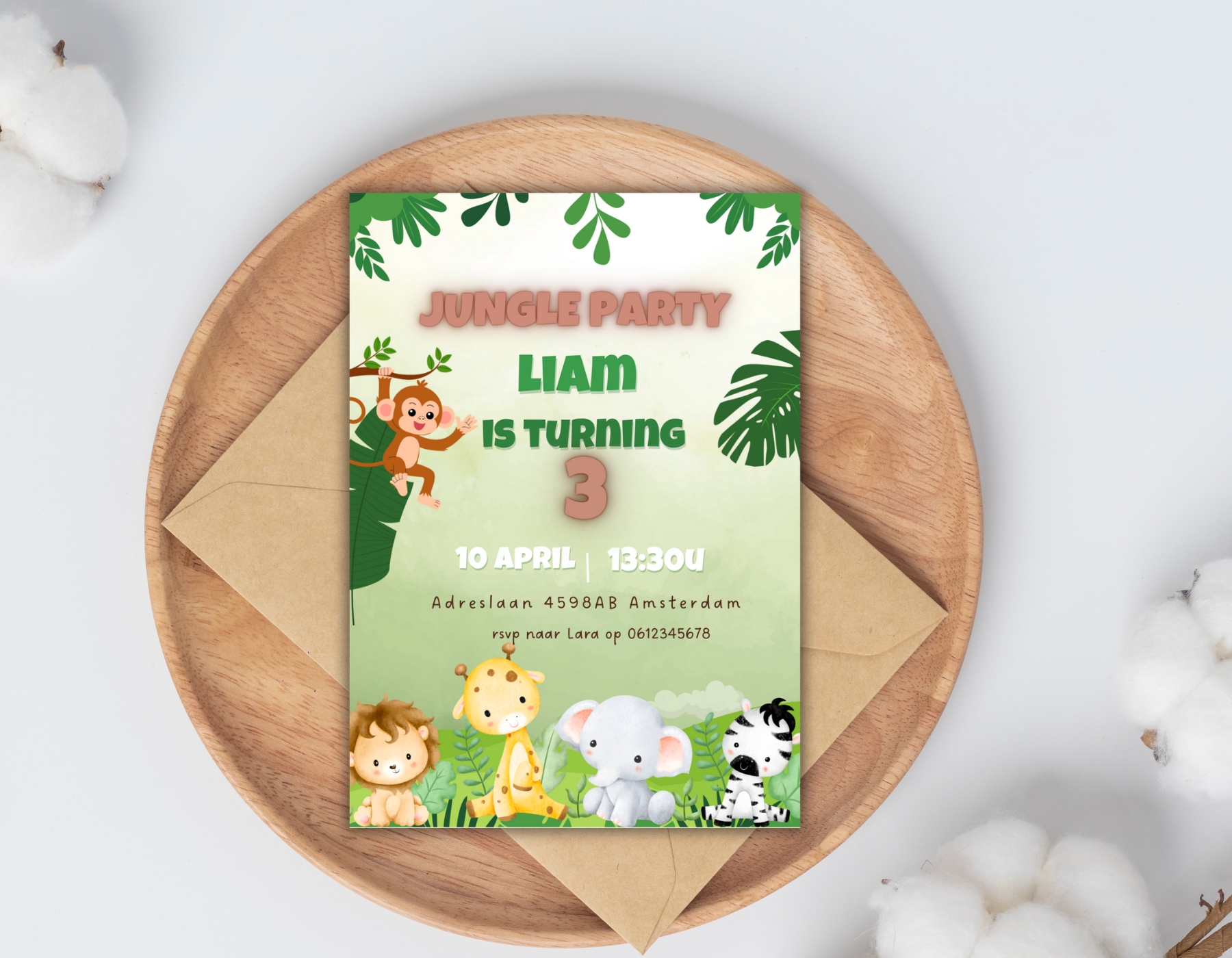 Of je nu een feestje plant met wilde dieren, jungle vibes of een dierentuinthema deze uitnodiging past perfect.