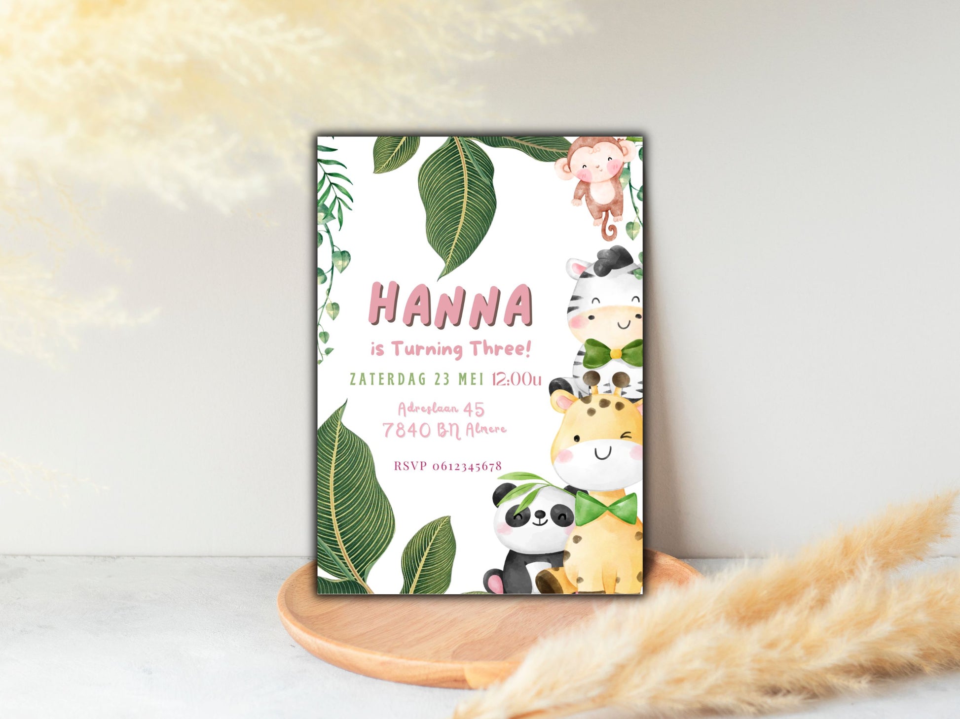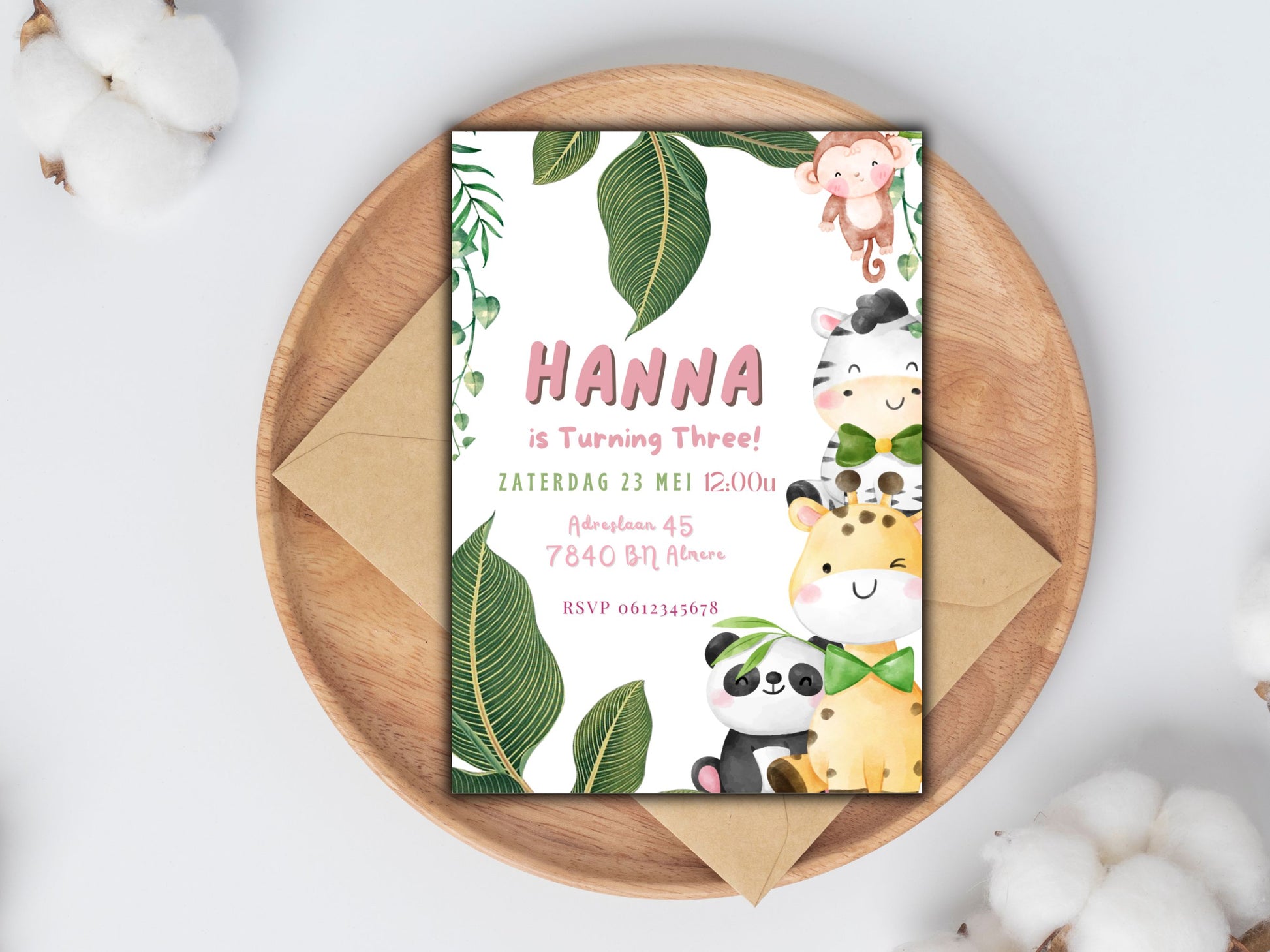 Een verjaardag is een bijzondere dag en dat mag gezien worden vanaf de uitnodiging. Met deze digitale safari uitnodiging kies je voor een stijlvol ontwerp waarin avontuur en elegantie samenkomen. Denk aan speelse dieren, subtiele details en een warme uitstraling die perfect past bij een feest vol herinneringen.