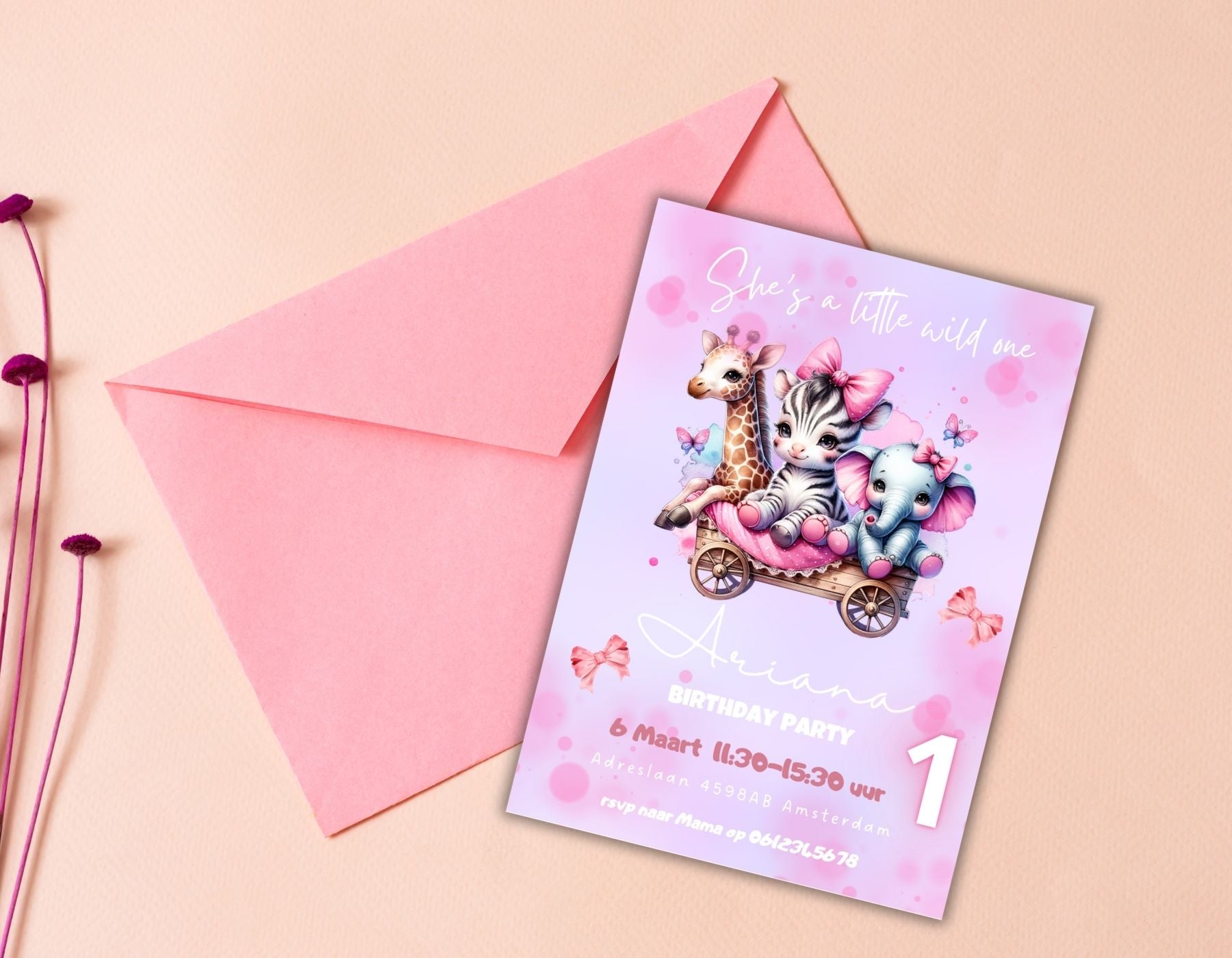 De zachte pastelkleuren, vrouwelijke details en vrolijke illustraties maken deze uitnodiging perfect voor jouw kleine wild meisje.