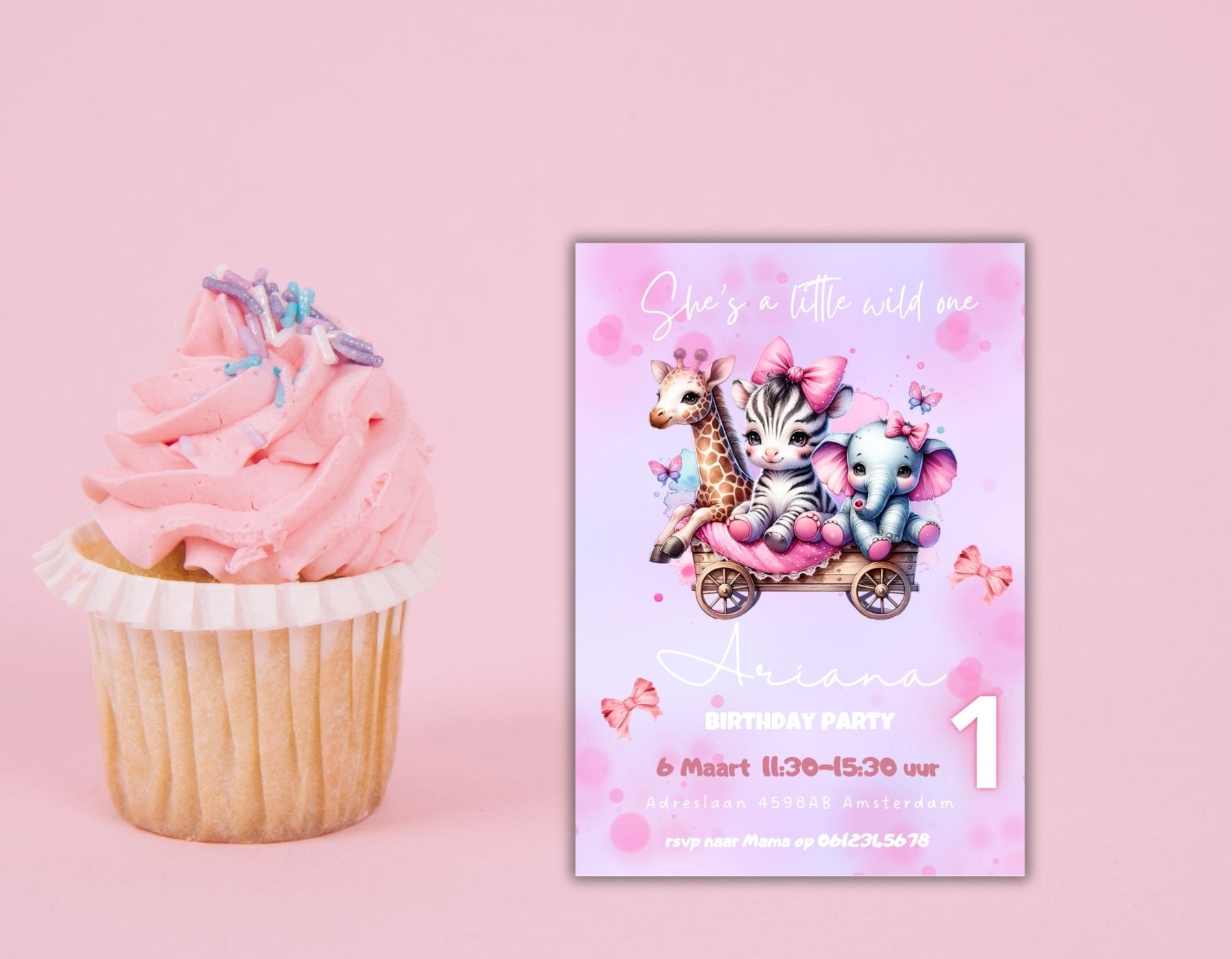 Ze kruipt, ze giechelt… en ze is een little wild one! Vier haar allereerste verjaardag in stijl met deze betoverende roze safari-uitnodiging met schattige jungledieren.