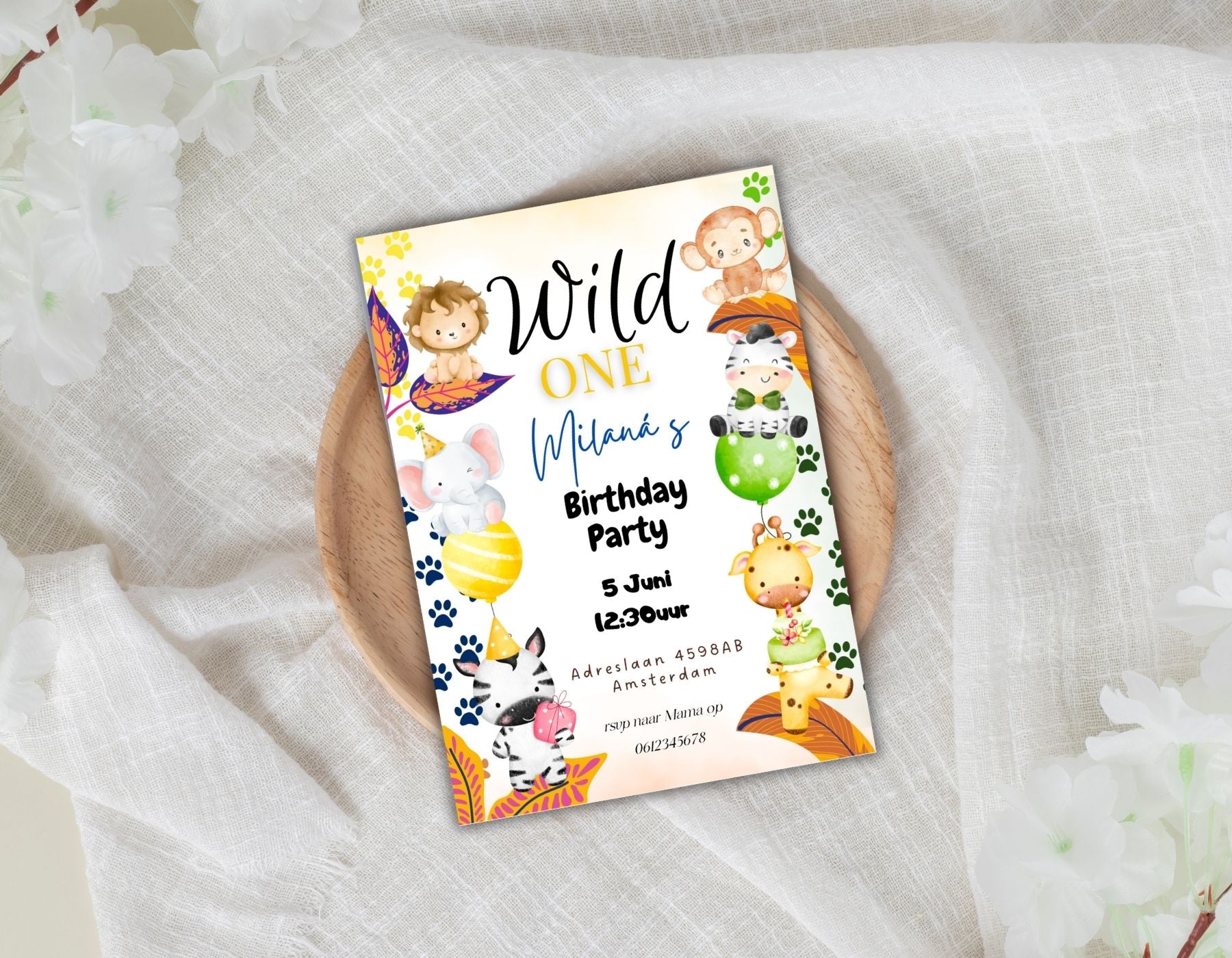 Laat familie en vrienden weten dat het tijd is voor een feest vol avontuur met onze vrolijke “Wild One” safari uitnodiging.