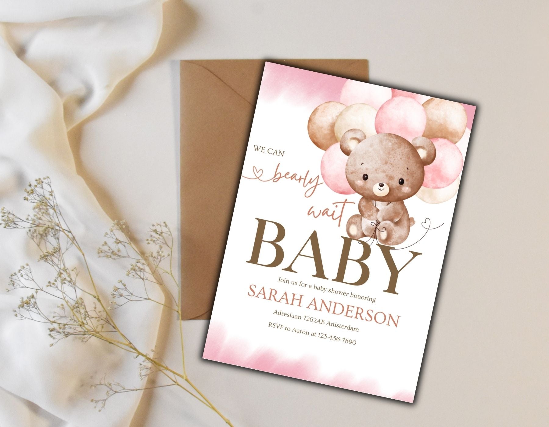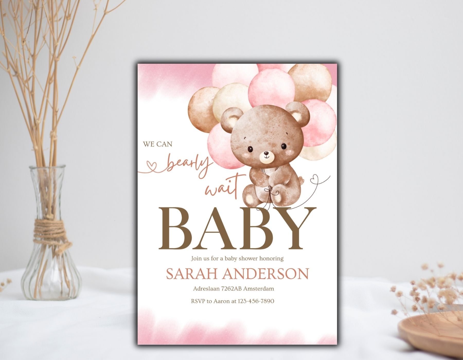 Een klein beertje is onderweg en we kunnen het bearly wachten om dit samen te vieren. Deze digitale “We Can Bearly Wait” uitnodiging straalt warmte en elegantie uit. Met zachte beige en roze tinten, en een minimalistisch teddybeerontwerp past deze uitnodiging perfect bij een babyshower.