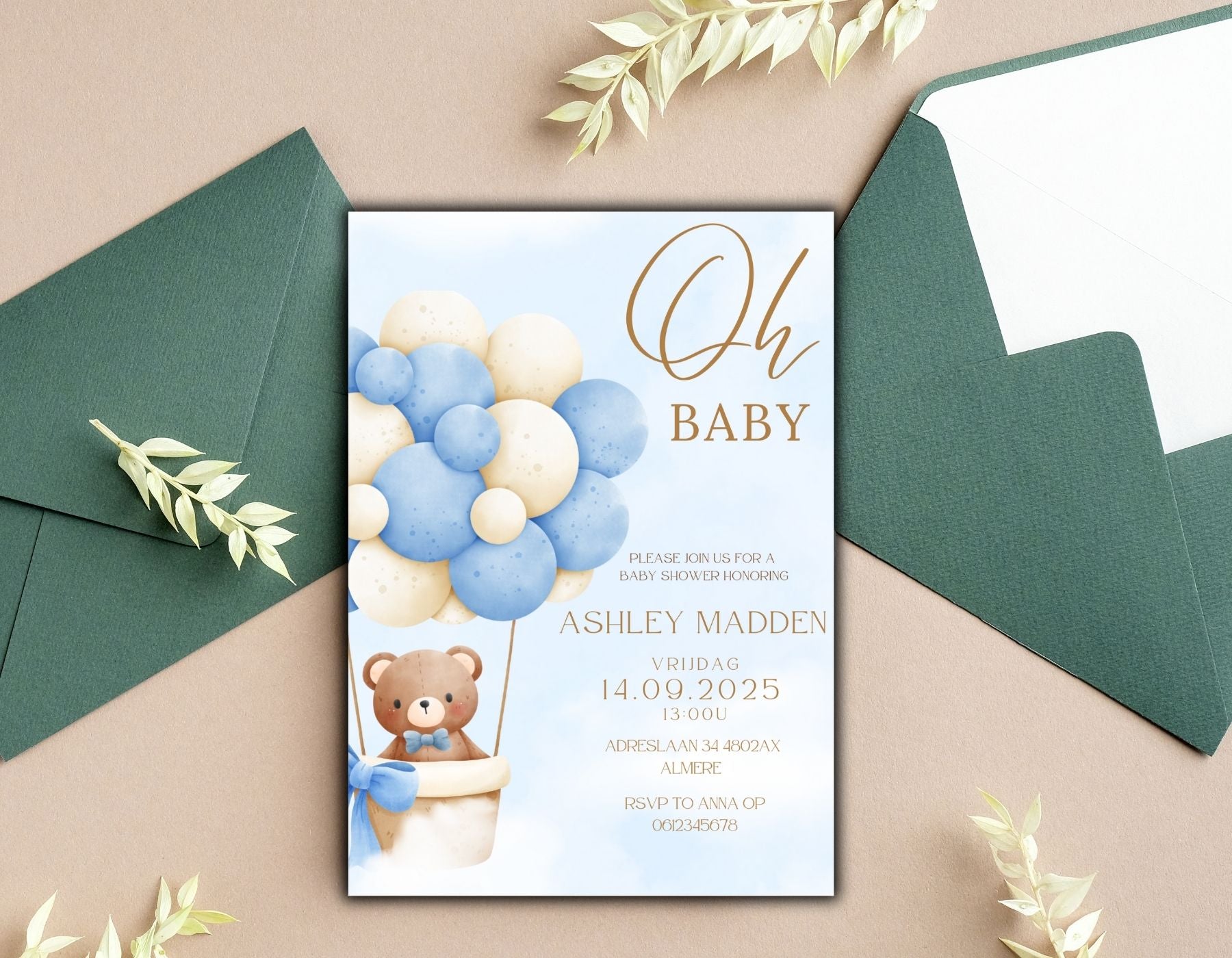 Soms zeggen zachte kleuren en een eenvoudig ontwerp meer dan duizend woorden. Onze teddybeer babyshower uitnodiging is minimalistisch, stijlvol en tijdloos. Met rustige blauw tinten, een elegante teddy-illustratie en subtiele details past hij perfect bij een rustige, chique babyshower.