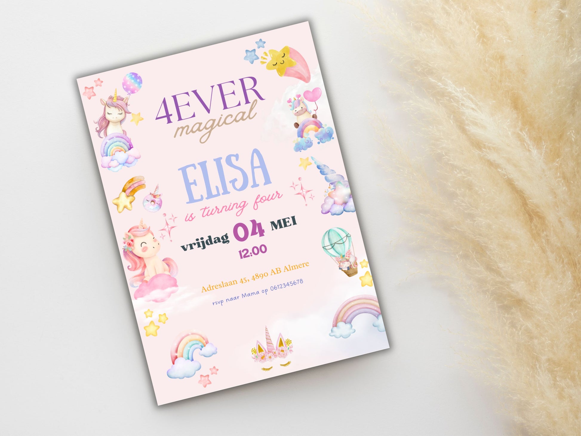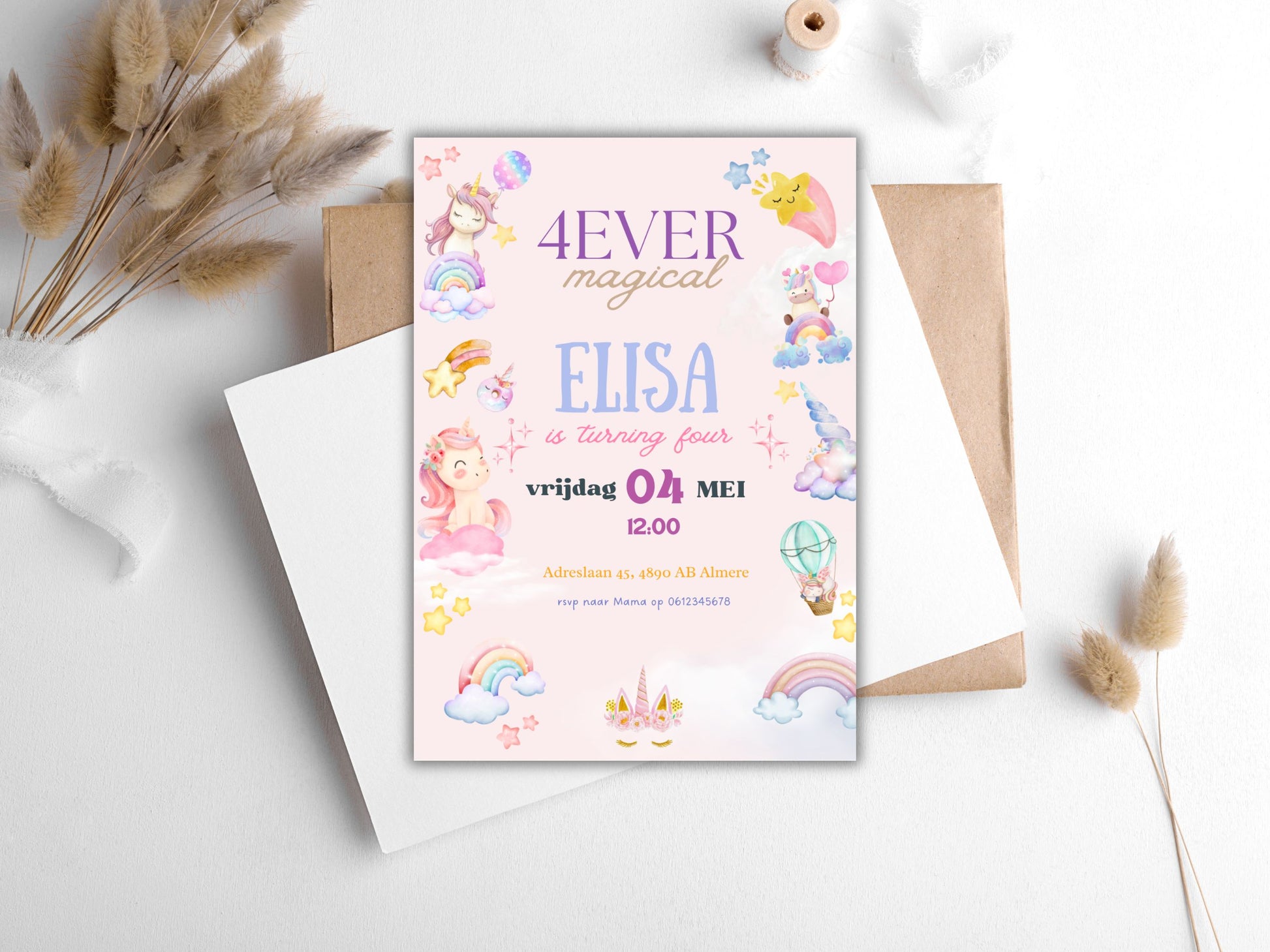 Maak de verjaardag van jouw kleine sprankel extra bijzonder met een uitnodiging vol magie, regenbogen en eenhoorns!