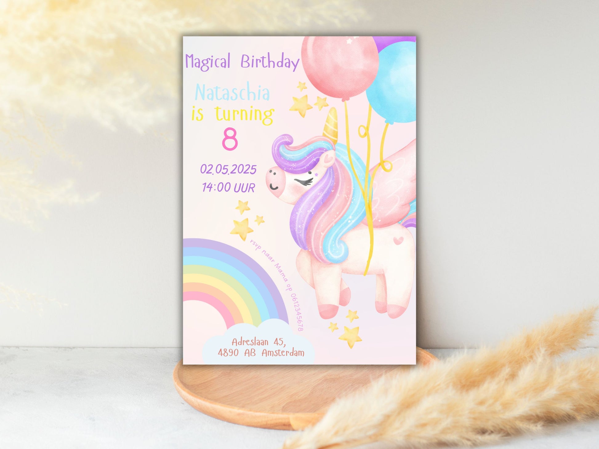 Het regenboogthema zorgt voor een vrolijke en feestelijke uitstraling die perfect aansluit bij een unicorn party. Laat de regenboogmagie beginnen met een uitnodiging die straalt van vreugde en fantasie!