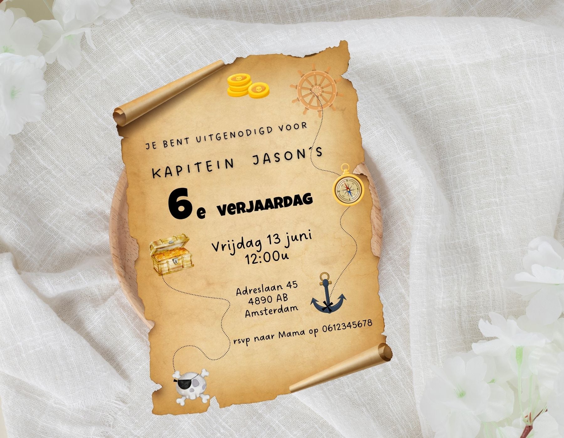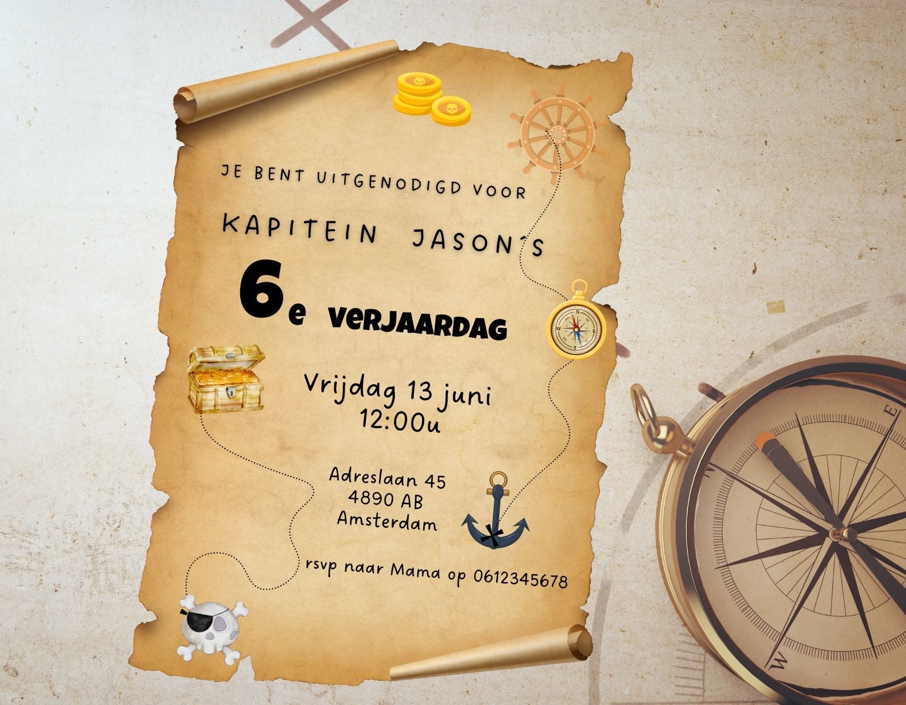Ahoy kapitein! Nodig alle kleine piraten uit voor een avontuurlijk verjaardagsfeest met deze stoere digitale piratenuitnodiging in schatkaart-stijl. Het ontwerp toont een klassieke piratenkaart vol leuke details.