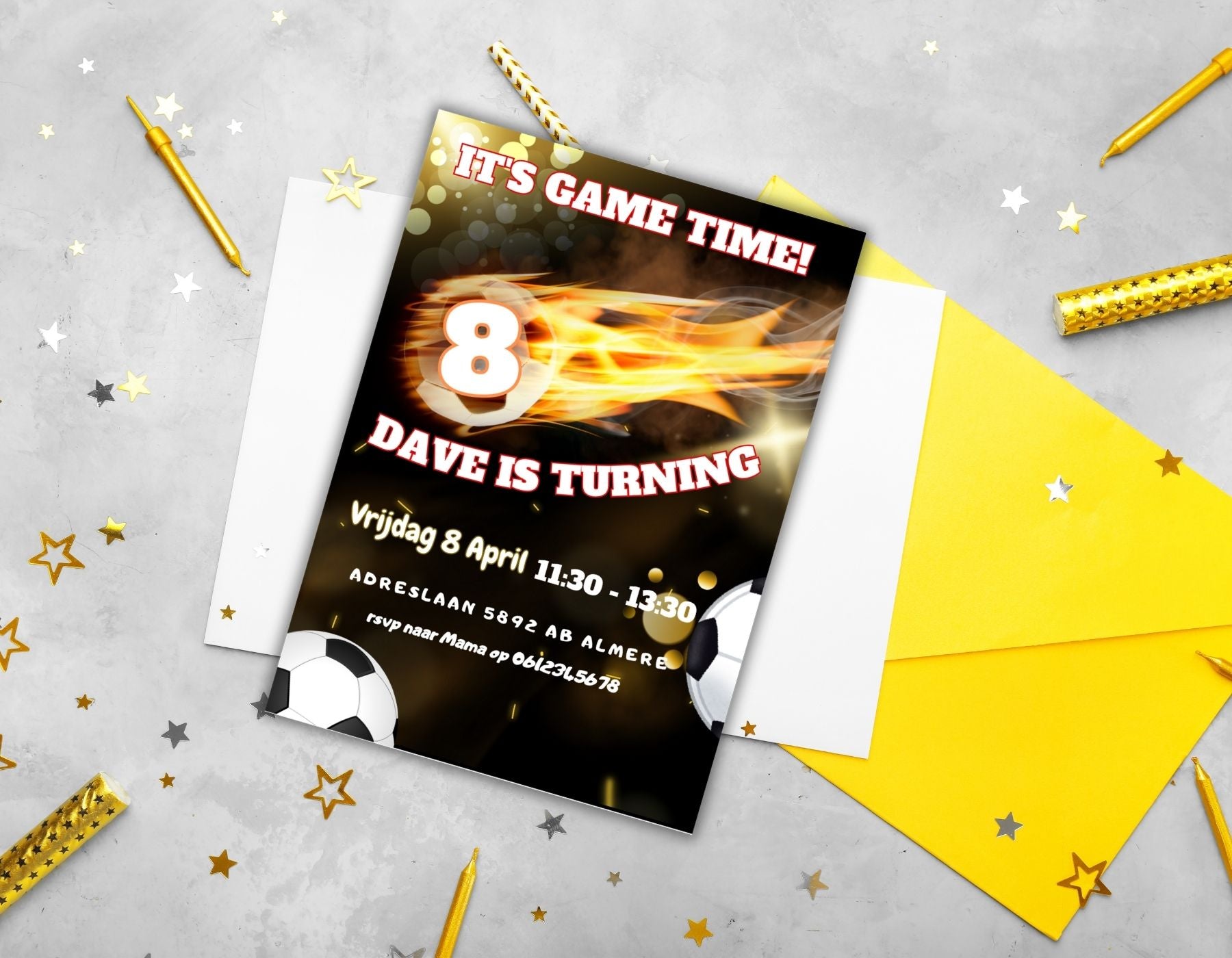 Is jouw kind gek op voetbal? Dan is deze knallende digitale uitnodiging een echte winnaar! Met stoere vlammen, een vliegende bal en de tekst "It’s Game Time!" weet iedereen meteen: dit wordt een feestje vol actie.